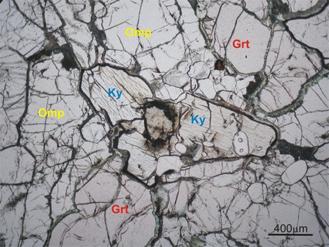 A small thin plate of eclogite imaged under a polarising microscope, shone through in parallel (top image) and in cross-cut (bottom image). It is made of smooth minerals of garnet, which appear completely black in cross-cut (Grt), cracked omphacite grains showing a slightly greenish colour in parallel-cut (Omp), and nicely split kyanite grains in the central part of the picture, which are most easily recognized by appearing in characteristic simple pairs (Ky). From the collection of Mirijam Vrabec. Photo: Mirijam Vrabec.
